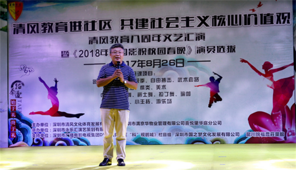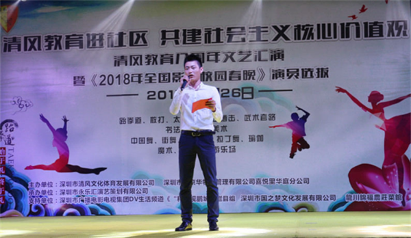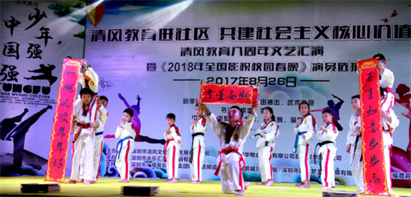 CCTV证券资讯频道城市中国网深圳报道(记者 陈功)2017年8月26日晚,原清风武道馆、现命名为清风教育基地成立八周年庆典及学员文艺汇演、暨2018年全国影视校园春节联欢晚会演员选拔演艺活动在深圳龙岗区喜悦里花园广场上盛大举行。