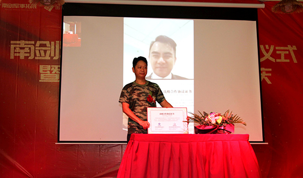 现场,南剑军事拓展基地代表陈伟强先生与爱米科技集团李建骅拿督视频连线签定战略合作协议,随后双方代表进行友好致辞。