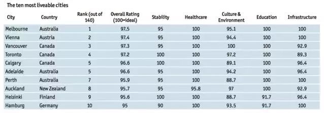 榜单考察了全球140个城市,根据30个关于稳定、医疗、教育、基建和环境方面的指标,给每个城市打出一个分数,100分是理想型。榜首的墨尔本,稳定方面得了95分,环境95.1分,医疗、教育和基建都是满分。